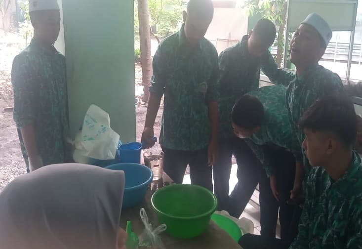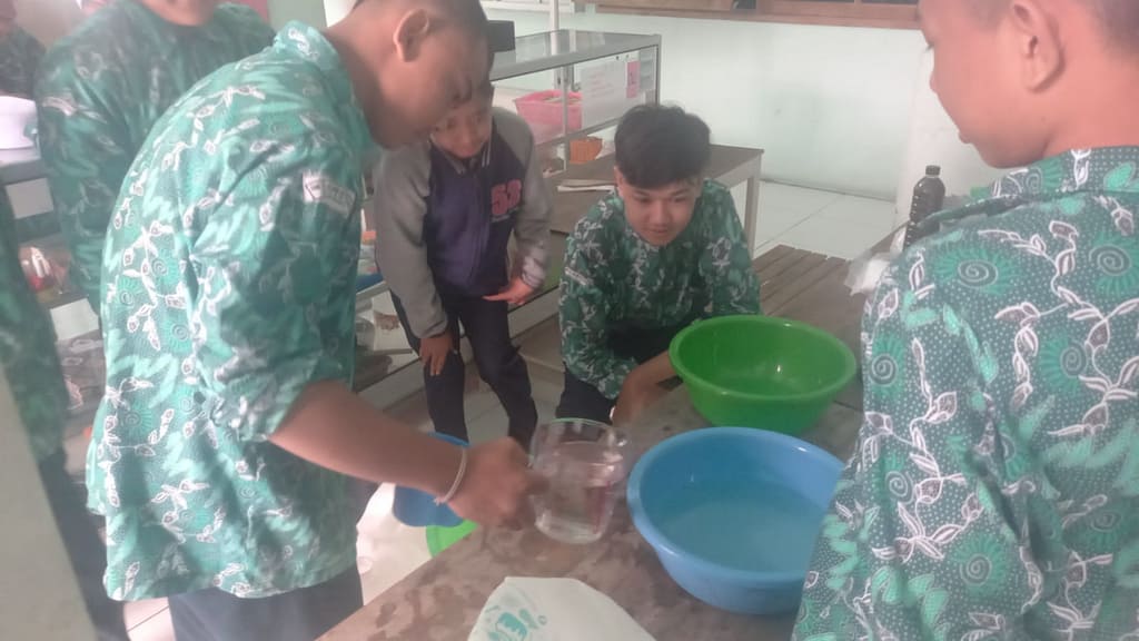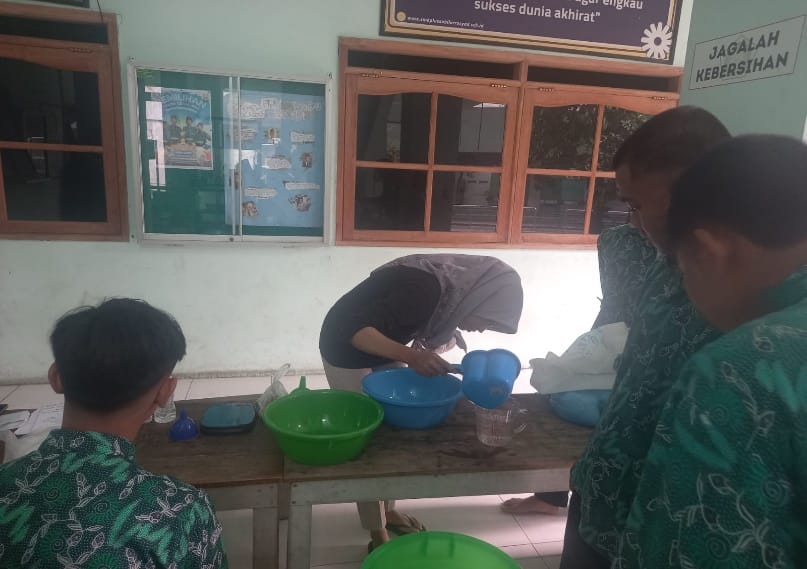 - Pelatihan membuat sabun cuci piring diketuai oleh Ibu Endah Mardewanti, S.Si., M.Pd. Ibu Endah membimbing dari awal pembuatan hingga pengemasan. Menurutnya, keberhasilan membuat sabun cuci piring terletak pada ketepatan meramu bahan sesuai dengan ukuran. Siswa-siswi diberikan penjelasan detai mengenai bahan-bahan kimia yang digunakan dalam pembutan sabun. Pembuatan biang sabun atau ‘Atinsoft’ adalah kunci dari kegiatan ini.