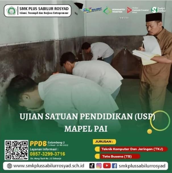 Ujian Satuan Pendidikan Praktek merupakan salah satu rangkaian ujian yang ditempuh oleh siswa kelas XII, yang berupa ujian praktek atau uji kompetensi keahlian. Untuk ujian sekolah praktik kelas XII TKJ SMK Plus Sabilur Rosyad diselenggarakan pada tanggal 14 – 16 Maret 2022. Mata pelajaran yang diujikan adalah pendidikan agama dan budi pekerti, pendidikan jasmani, kesehatan dan olahraga, seni budaya, dan produk kreatif dan kewirausahaan.