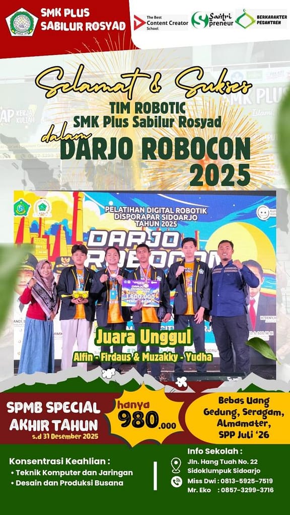 Prestasi membanggakan diraih oleh siswa SMK Plus Sabilur Rosyad, yang berhasil meraih Juara Unggul dalam lomba dan pelatihan digital robotik “Darjo Robocon 2025 Panen Bandeng” yang diadakan Disporapar bekerja sama dengan Komunitas Kampung Robot. Lomba dan pelatihan ini diikuti oleh jenjang SMP dan SMK sederajat se Kabupaten Sidoarjo dan diadakan pada tanggal 28 November 2025 di atrium Sun City Mall Sidoarjo. Ada 2 tim yang diikutkan lomba tersebut. Yakni Tim 1 Yang bernama Santri Kaciuw yang terdiri dari Alvin Faiz dan Moh Firdaus Noorsyah Sukiwijaya yang berasal dari kelas XII dan Tim 2 yang dipunggawai Muzakki Rahmat dan Muh Yudha Pratama dari kelas X. grup ini diberi nama Santri Cakep. Tim 1 Santri Kaciuw atas nama Alvin Faiz dan Moh Firdaus Noorsyah Sukiwijaya.